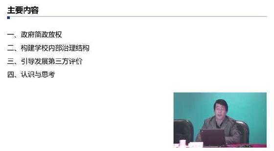 新一轮教育综合改革,旨在推进教育治理体系和治理能力现代化,实施依法治教,关键是抓好管办评分离改革,核心是建设现代学校制度,使学校成为具有内生活力的办学主体。本课程中,主讲人围绕政府简政放权、构建学校内部治理结构和引导发展第三方评价三个方面,详细介绍了青岛市在现代学校制度建设中的做法和经验。