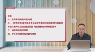 教师应在教学工作中领会教育家精神的实质,明确教育家精神不仅仅是“只有极少数教育家才能拥有的精神”,而是每一位教师通过努力学习与扎实践行也能够达到的精神境界。本课程中,主讲人以弘扬教育家精神、矢志立德树人为主题,对中小学师德师风问题作了针对性的阐述,强调了教育家精神的丰富内涵以及对弘扬教育家精神的要求,通过实际案例阐明了常见的师德师风问题,并提出了相应的工作措施与对策,有助于中小学教师不断调整和优化自身的职业行为,努力培育践行教育家精神,将教育家精神内化于心、外化于行。