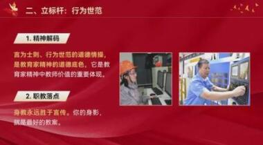 本课程中,主讲人介绍了以车间为职业教育核心场域,提炼出一套独具特色的教育家精神实践体系——“职教配方”,通过“定方向、立标杆、启智慧、修本领、付真情、拓格局”六大模块,将崇高的育人理念转化为可落地、可操作的教学行动,课程结合金牌选手培养、教师参赛示范等真实案例,生动展现在实践熔炉中培养出有精湛技艺又有职业精神的新时代工匠,让教育家精神在机器轰鸣中生根发芽,为职业教育注入灵魂。