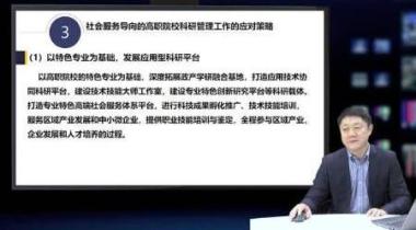 本课程中,主讲人从政策文件要求、区域发展需要和行业企业需求三个层面,分析了高职院校应以社会服务为导向,加强与政府、行业企业的深度合作,打造技术技能创新服务平台,着力科技攻关、人才培养等,推动新产品开发和技术成果转化。他指出,高职院校科研管理目前存在“GDP主义”“马太效应”“低转化率”“学术漂移”等问题,究其原因,主要是量化评价引起的竞争式发展和行政权力泛华引起的捆绑式发展。他认为,要想扭转这一局面,应从应用型科研平台建设、科技人才引进与培养、科研社会服务共享平台建立等方面着手,并结合长春金融高等专科学校的一些有益实践予以说明。