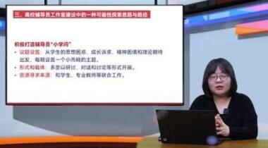 高校辅导员工作室是促进辅导员队伍专业化、职业化、专家化建设的有效载体。本课程中,主讲人主要是以高校辅导员工作室建设与培育为主题讲授,围绕当前高校辅导员工作室的建设经验与总体特征、辅导员工作室尚需进一步思考与实践之处以及一些可能性探索思路与路径为内容展开。具体回答了三个问题,一是“如果要建设一个辅导员工作室的话,需要关注和把握哪些基本要素与配置”;二是“如果要进一步做好辅导员工作室,在内涵式发展上寻求进一步发展的话,需要关注和解决的内容”;三是“以一种探索思路与路径为例进行说明,以此提供一种工作室建设过程中的可能性方向”。希望通过本课程为高校辅导员在建设与培育工作室的过程中提供一些启发与思考。