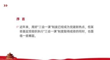 近年来,用好“三会一课”制度已经成为党建新热点,但某些基层党组织执行“三会一课”制度取得成绩的同时,也面临一些难题。本课程主讲人详细分析了目前“三会一课”存的问题及主要原因,并对如何提升效果提出了对策与建议。