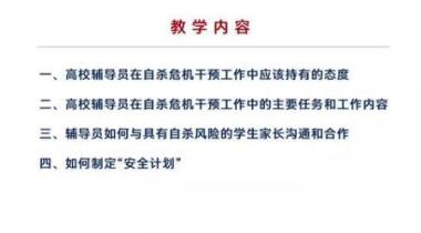 在多种因素的交织下,高校的危机事件不时发生,而且类型、诱因复杂,辅导员是第一线的学生工作者,是开展大学生思想政治教育的骨干力量,在大学生成长、成才过程中扮演着教育者、指导者、管理者、服务者的重要角色,辅导员的危机处理能力是辅导员职业能力的核心部分,直接关系到学生的健康成长,关系到和谐校园、和谐社会的建设。本课程中,主讲人通过分享案例阐述了高校辅导员在自杀危机干预工作中应该持有的态度,详细讲解了辅导员在自杀危机干预工作中的主要任务和工作内容,阐明了如何与学生家长沟通与合作,并制定“安全计划”,强调了辅导员应以积极干预的心态通过各种途径及时预防和发现危机,用合适的方式方法对学生进行干预,加强对学生生命价值方面的教育,且注重自我保护,利用团队力量,指导生命的旅途需要多方的参与、支持与关注。