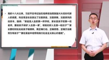 本课程中,主讲人从家风家教家规的定义切入,举例充分说明有什么样的家教,就有什么样的人。再介绍了传承弘扬良好家教家风的意义与路径,总结家风和家教,对于树立青少年正确道德观念、引导做人的气节和骨气,形成美好心灵,促进健康成长有着至关重要的作用。