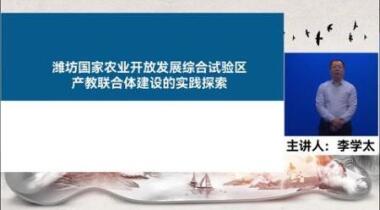 在中共中央办公厅、国务院办公厅印发《关于深化现代职业教育体系建设改革的意见》,落实“一体、两翼、五重点”重要举措的政策背景下,在潍坊国家农综区推进办牵头统筹下,以政行校企多元主体,共建基于产业园区、服务园区产业的产教融合服务组织——潍坊国家农综区产教联合体,山东畜牧兽医职业学院作为牵头院校,本课程主讲人结合学校工作实践,分享了农综区产教联合体建设的实践、成效与经验启示。